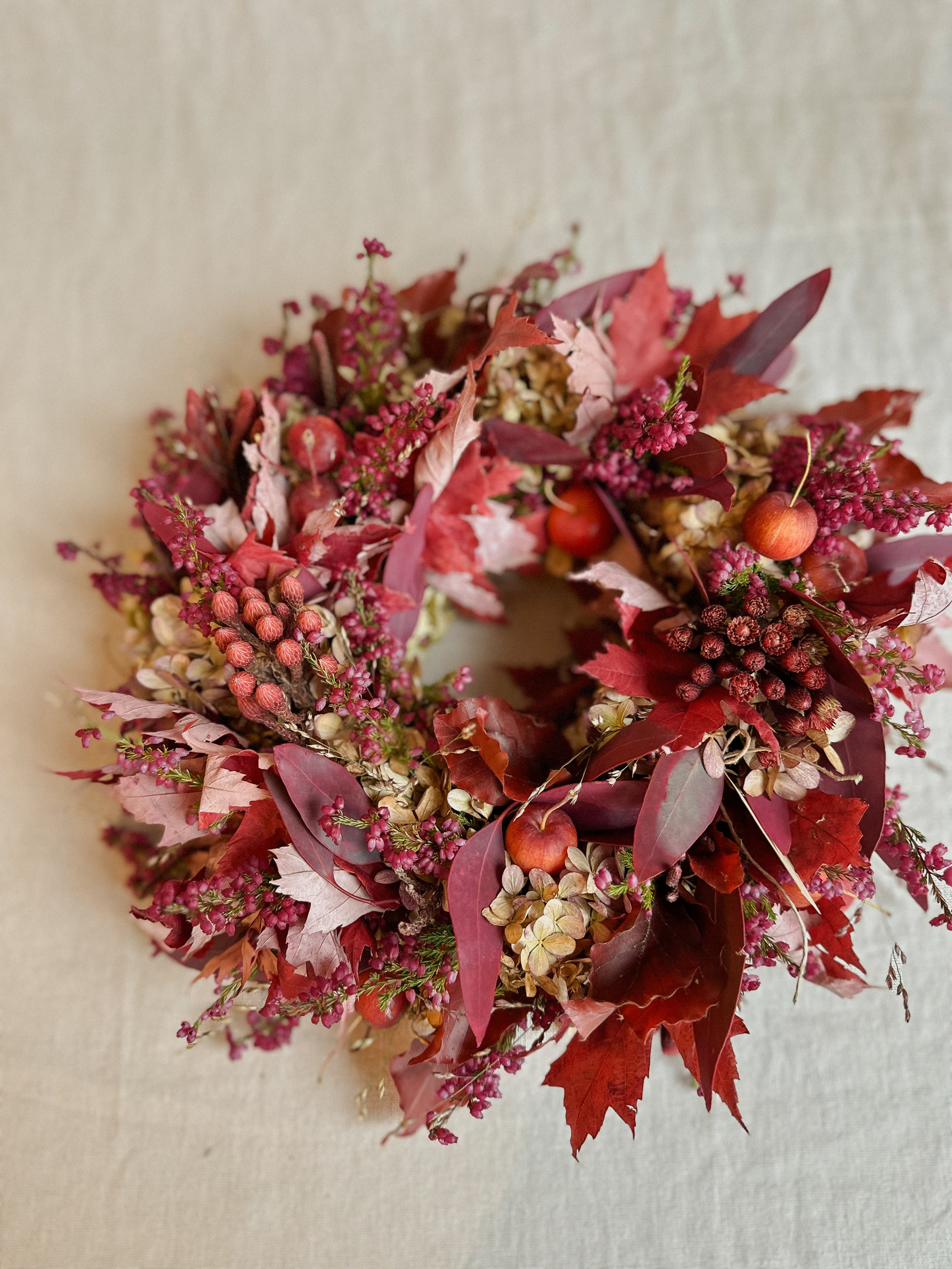 Der romantische unter den Herbstkränzen. Warm in den Tönen, voll mit Laub, kleinen Zieräpfeln, Eukalyptus, Hortensien und etwas Kapgrün. Er duftet nach Herbstspaziergang und sieht aus, als hätte er sich direkt aus dem Garten geschlichen. Kein Schnickschnack, einfach schön. Zum Hinlegen gedacht, für Tisch, Kommode oder wo grad Platz ist.