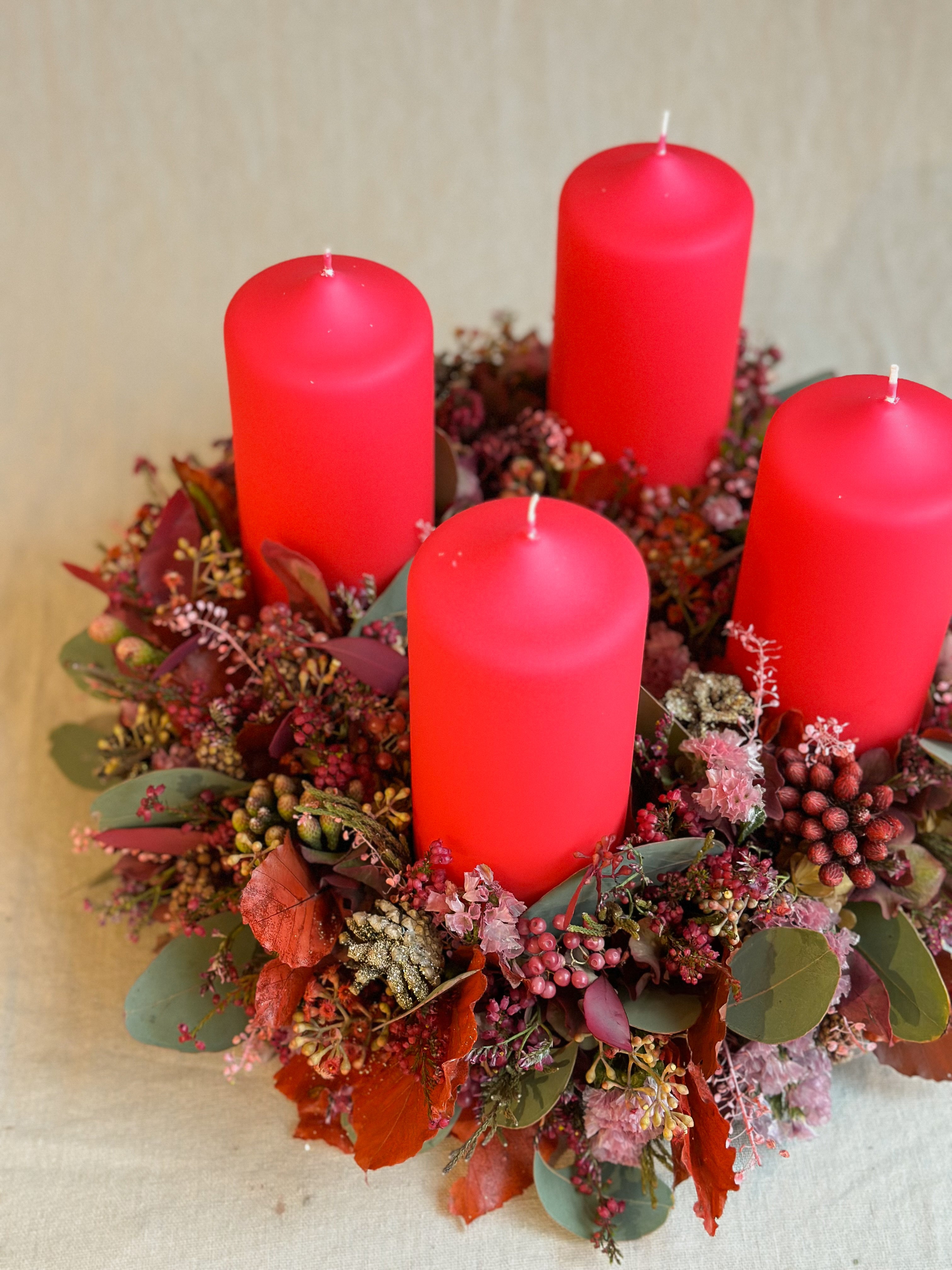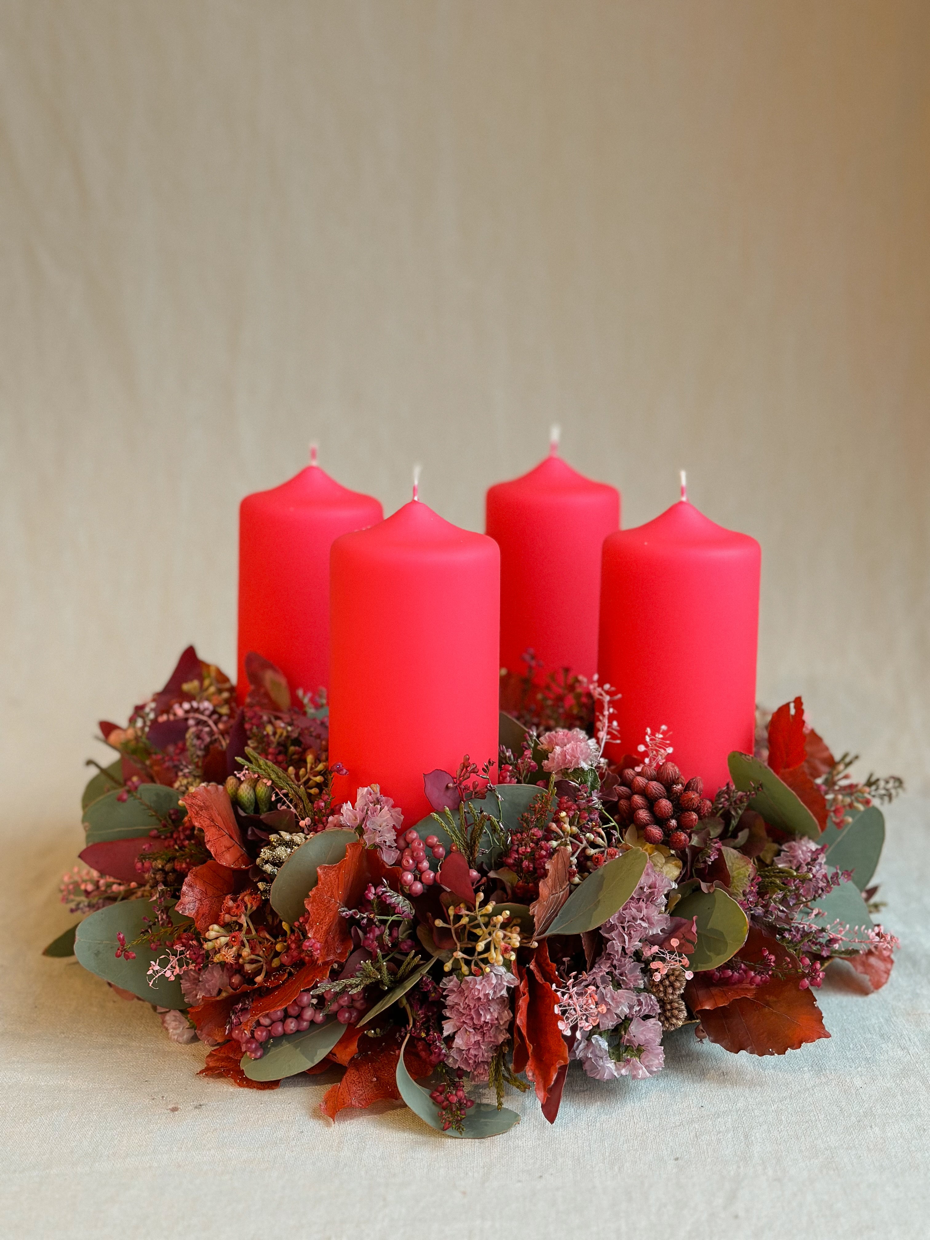 Dieser Adventskranz wird nicht gebunden, sondern liebevoll gesteckt. Ganz ohne Drahtsalat, dafür mit Gefühl. Feine Naturmaterialien, Beeren, Blätter und zarte Trockenblüten fügen sich zu einem Kranz, der schon beim Ansehen leuchtet.