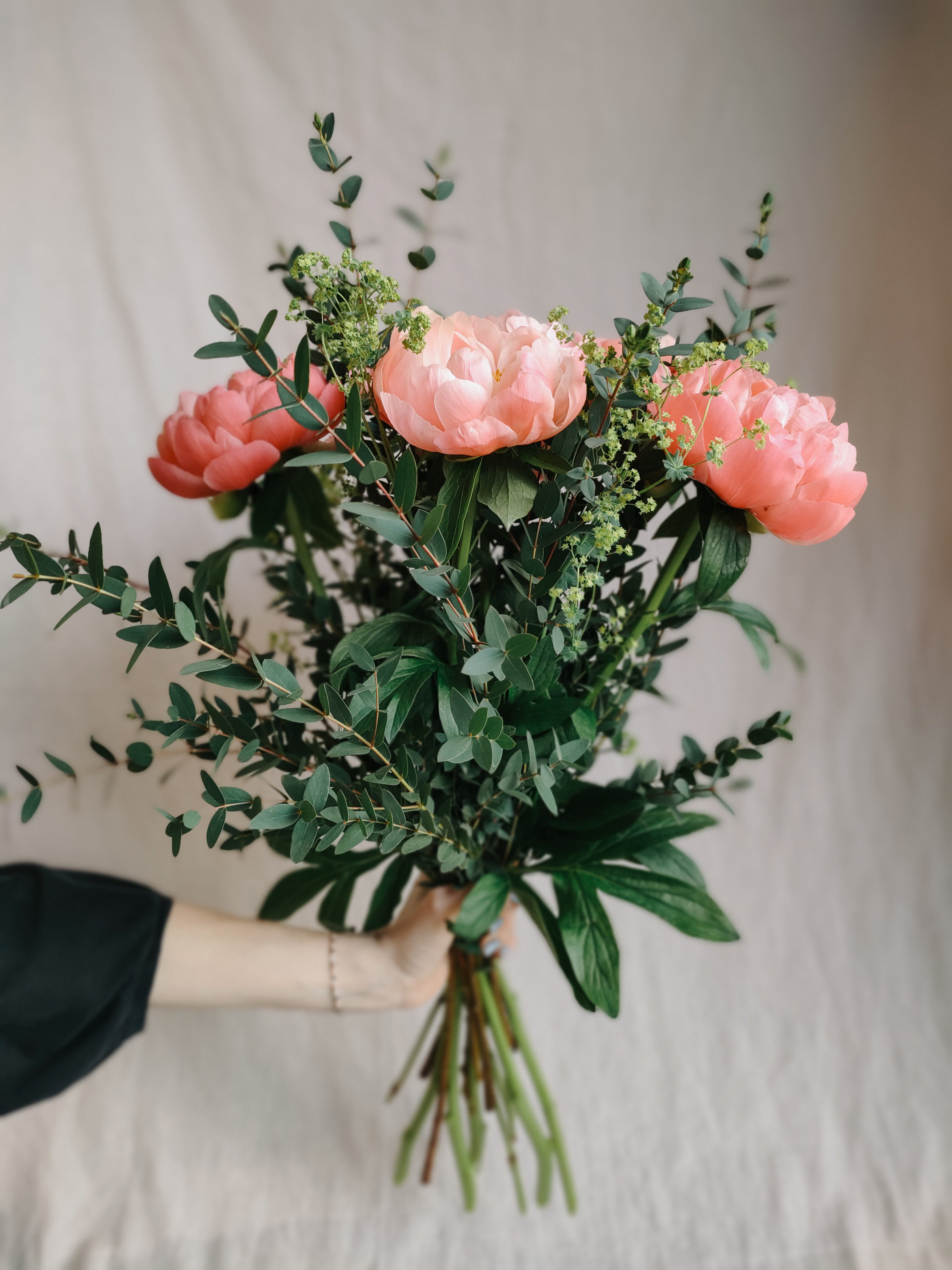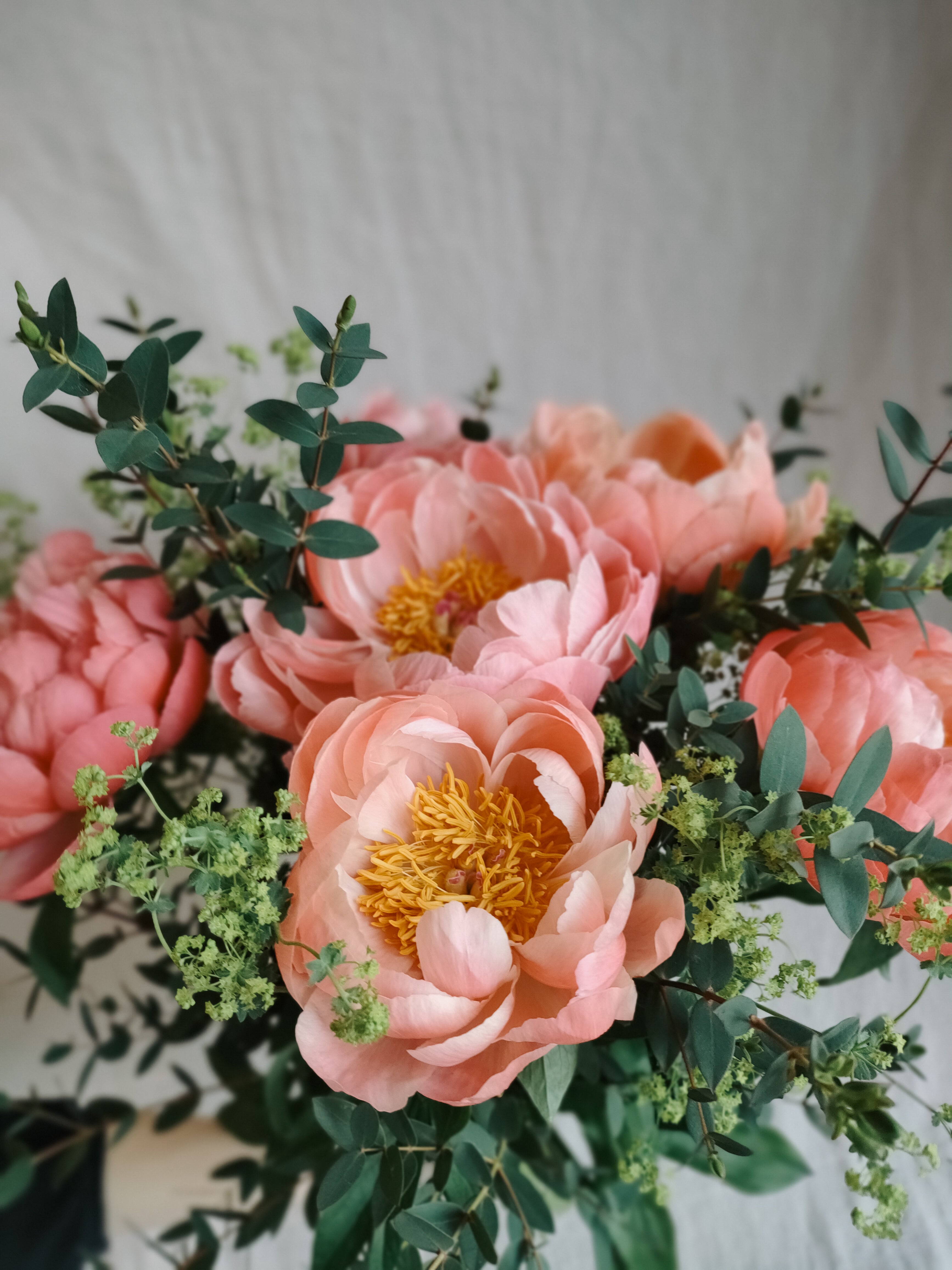 Pfingstrosen und zwar die allerallerschönsten. Diese tragen den wunderschönen Namen «Coral Charme». Das Schöne an diesen Pfingstrosen: Sie vollziehen einen Farbwechseln von Koralle zu hellem Beige. Mit Grün ausgarniert.