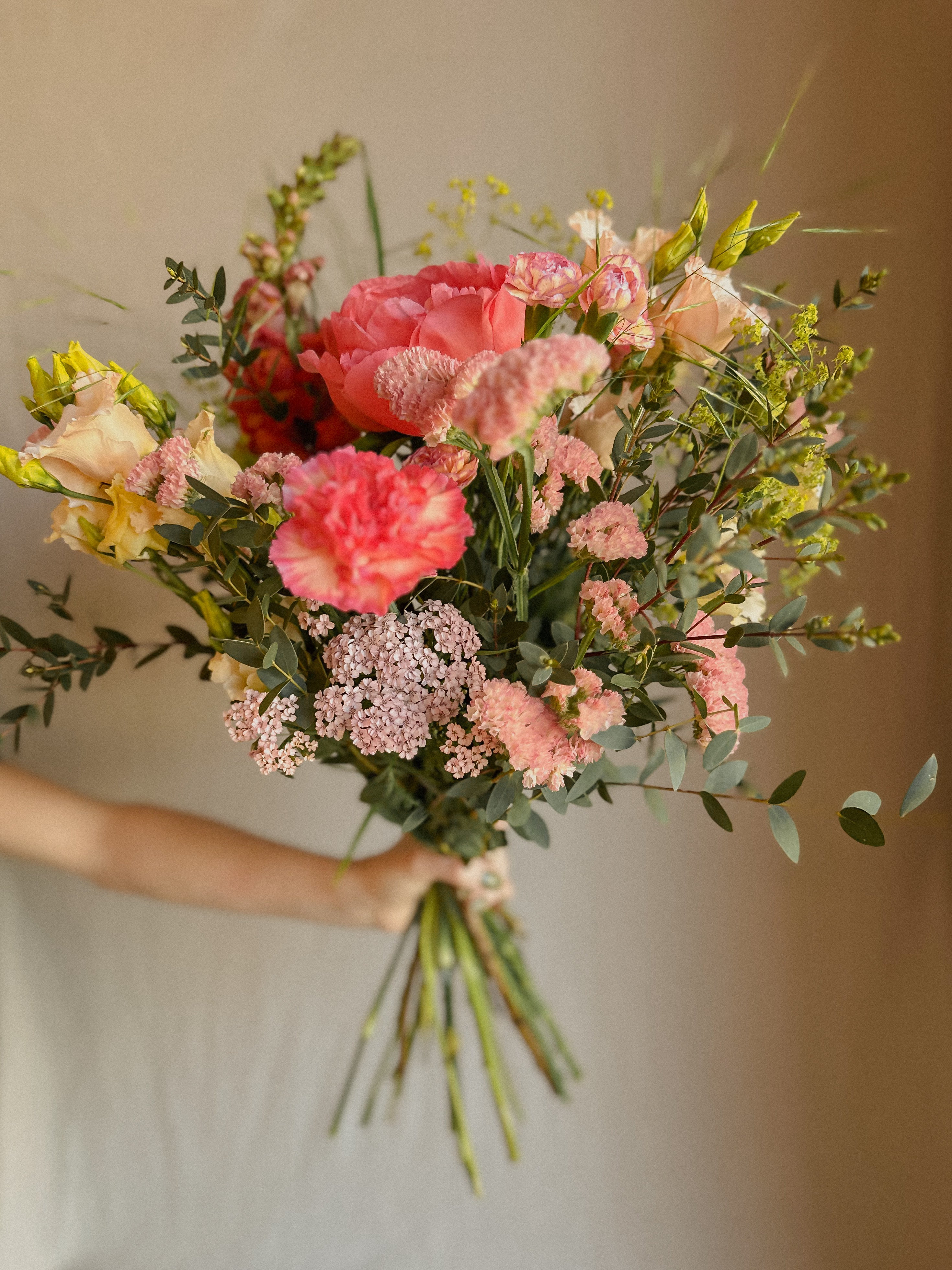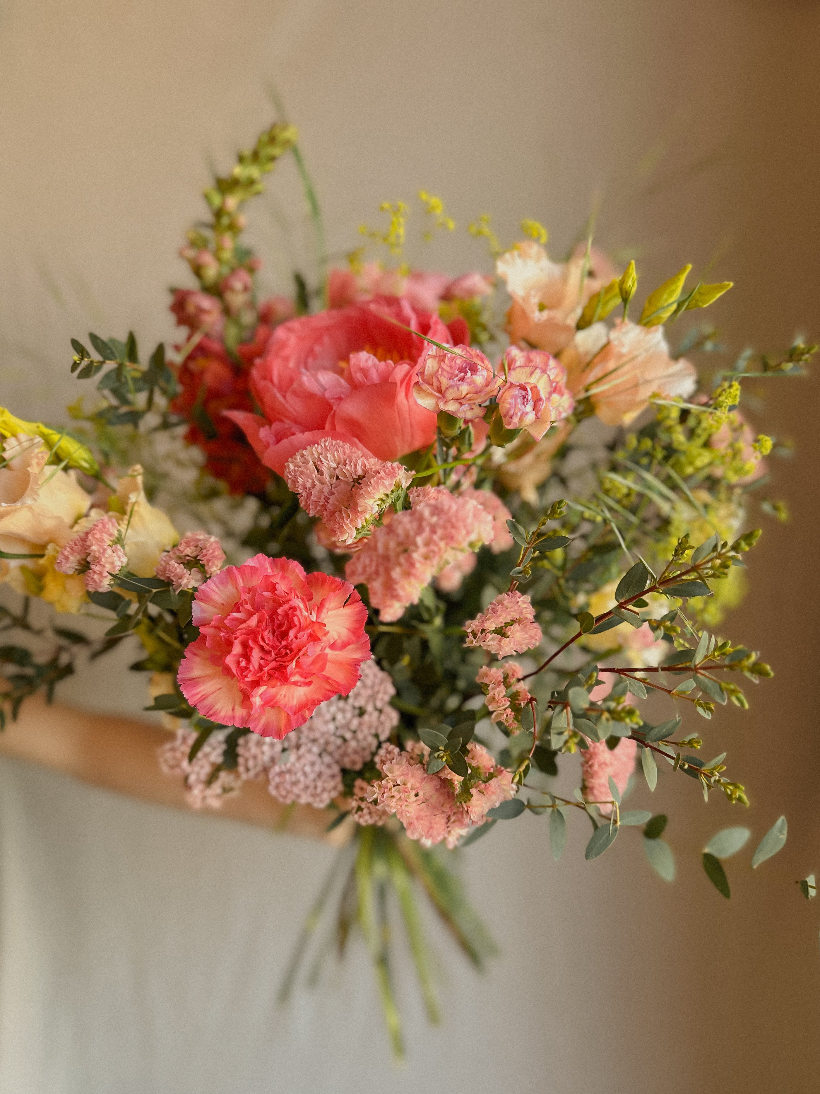 Ein Spiel aus Licht und Farbe: Leuchtende Coral-, Apricot- und Pinktöne treffen auf eine üppige Pfingstrose und entfalten eine warme, fast strahlende Wirkung. Kompakt gebunden und reich an Blüten wirkt dieser Strauss gleichzeitig festlich und lebendig.