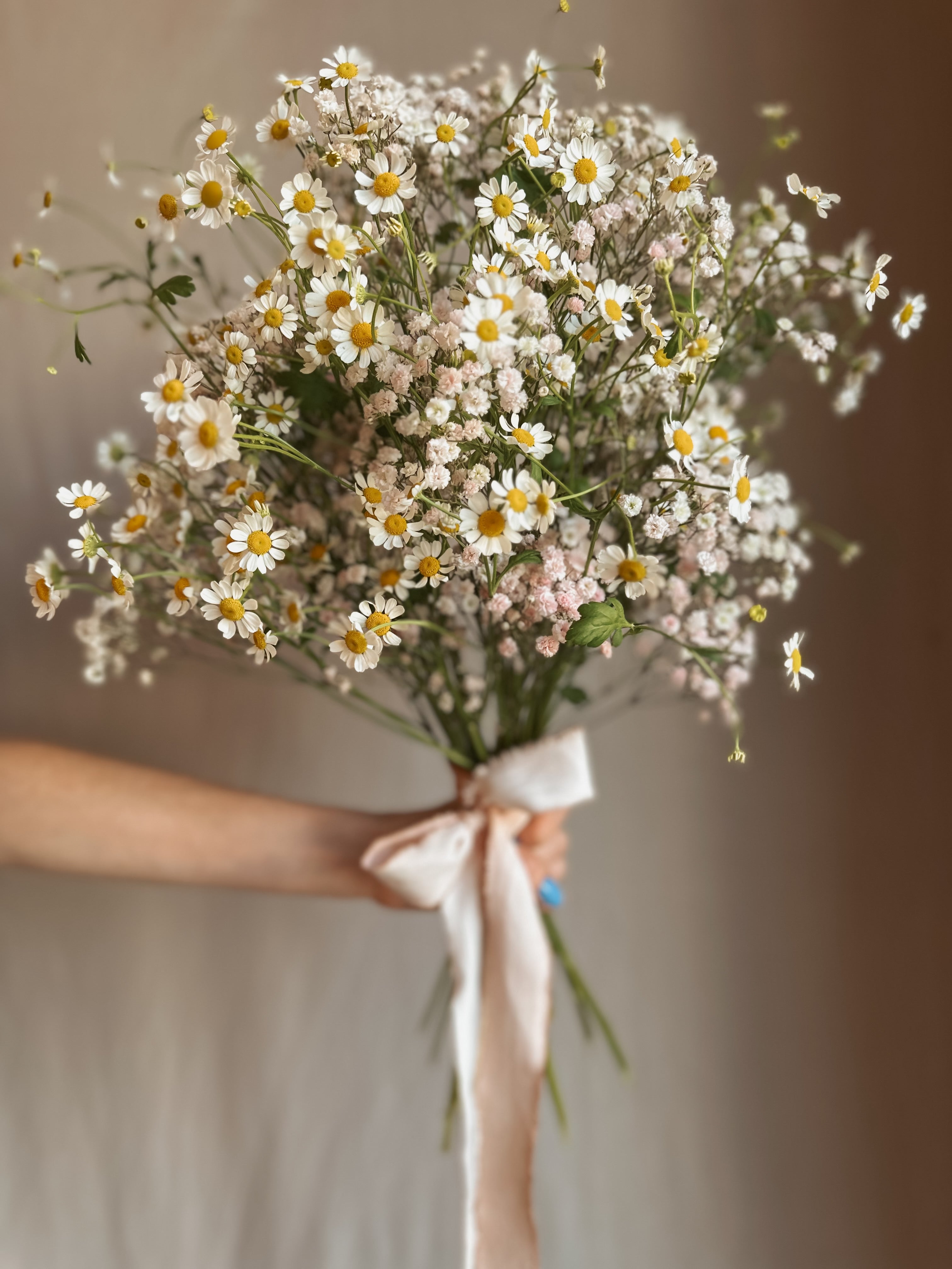 Wie ein Sommertag, der einfach bleibt. Dieser Blumenstrauss aus Kamille und Schleierkraut wirkt leicht und unbeschwert – fast ein bisschen verträumt. Kleine, feine Blüten tanzen durcheinander, weich, luftig, ohne Schwere. Nichts Lautes, sondern Ruhe, Leichtigkeit und ein Hauch von Wiese fürs Zuhause. Frisch gebunden mit saisonalen Blumen und ideal zum Verschenken oder für sich selbst.