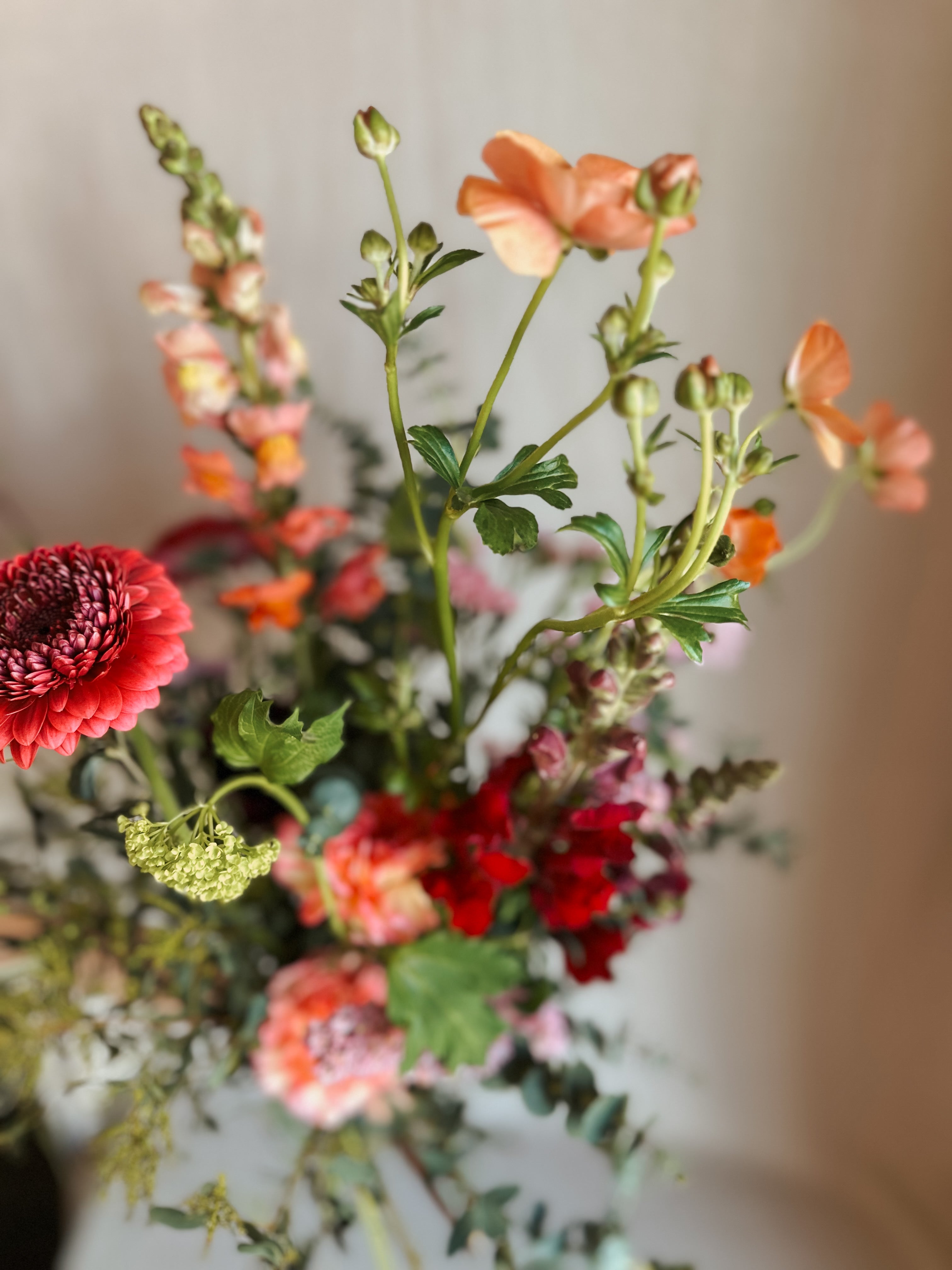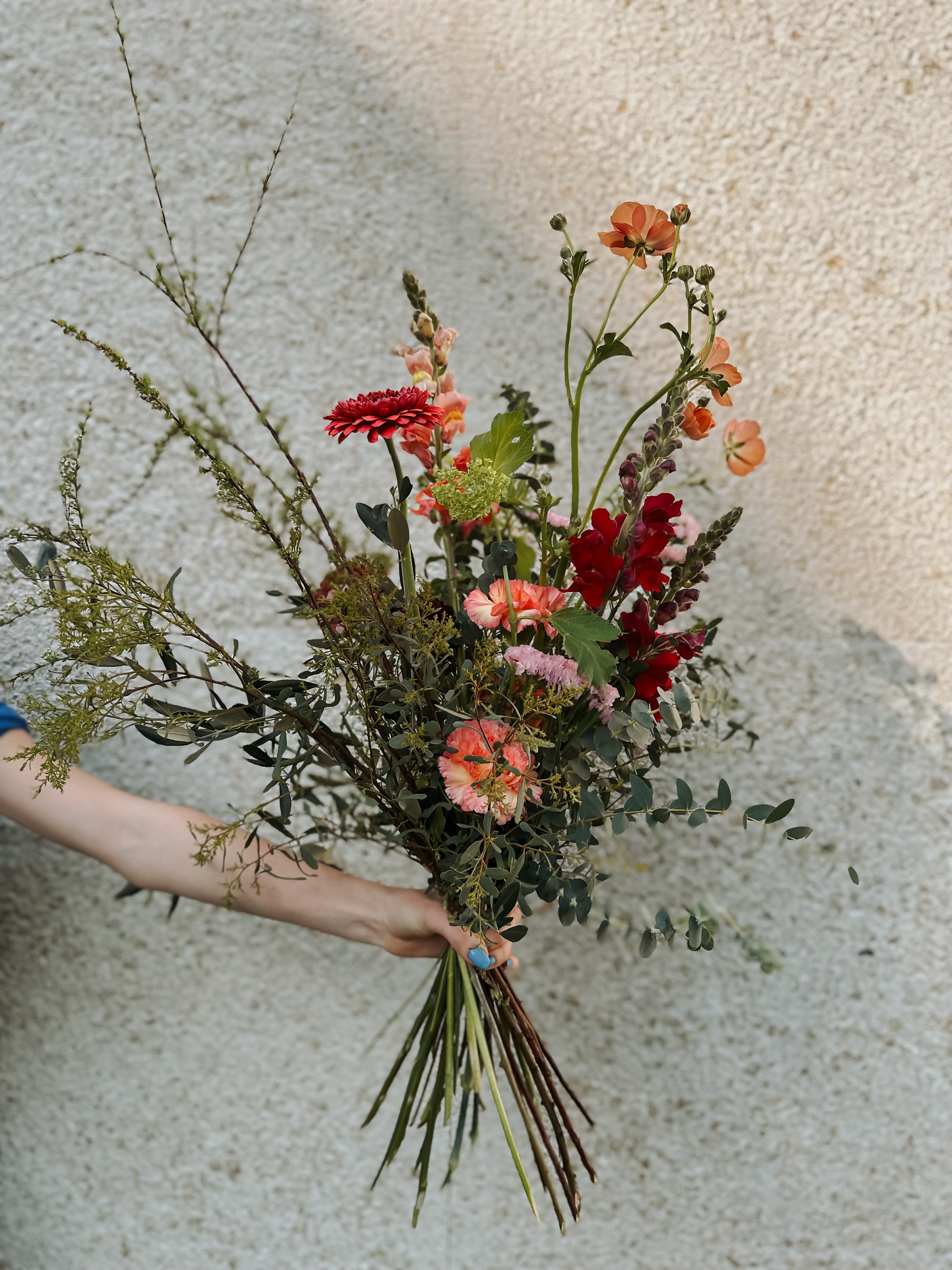 Wie frisch gepflückt und einfach losgelassen. Dieser Blumenstrauss lebt von seinen Linien – luftig, leicht, ein bisschen wildgewachsen. Apricot, Orange, Pink und tiefes Bordeaux treffen aufeinander, dazwischen Blüten, die sich strecken, drehen, Raum einnehmen. Frisch gebunden mit saisonalen Blumen, nichts Kompaktes, sondern Bewegung und Tiefe, fast wie ein kleiner Garten in der Hand. Ideal zum Verschenken oder um sich selbst ein Stück Natur ins Zuhause zu holen. Von Hand gebunden in unserem Atelier in Wädenswil, jeder Strauss ein Unikat und bereit für die Lieferung.