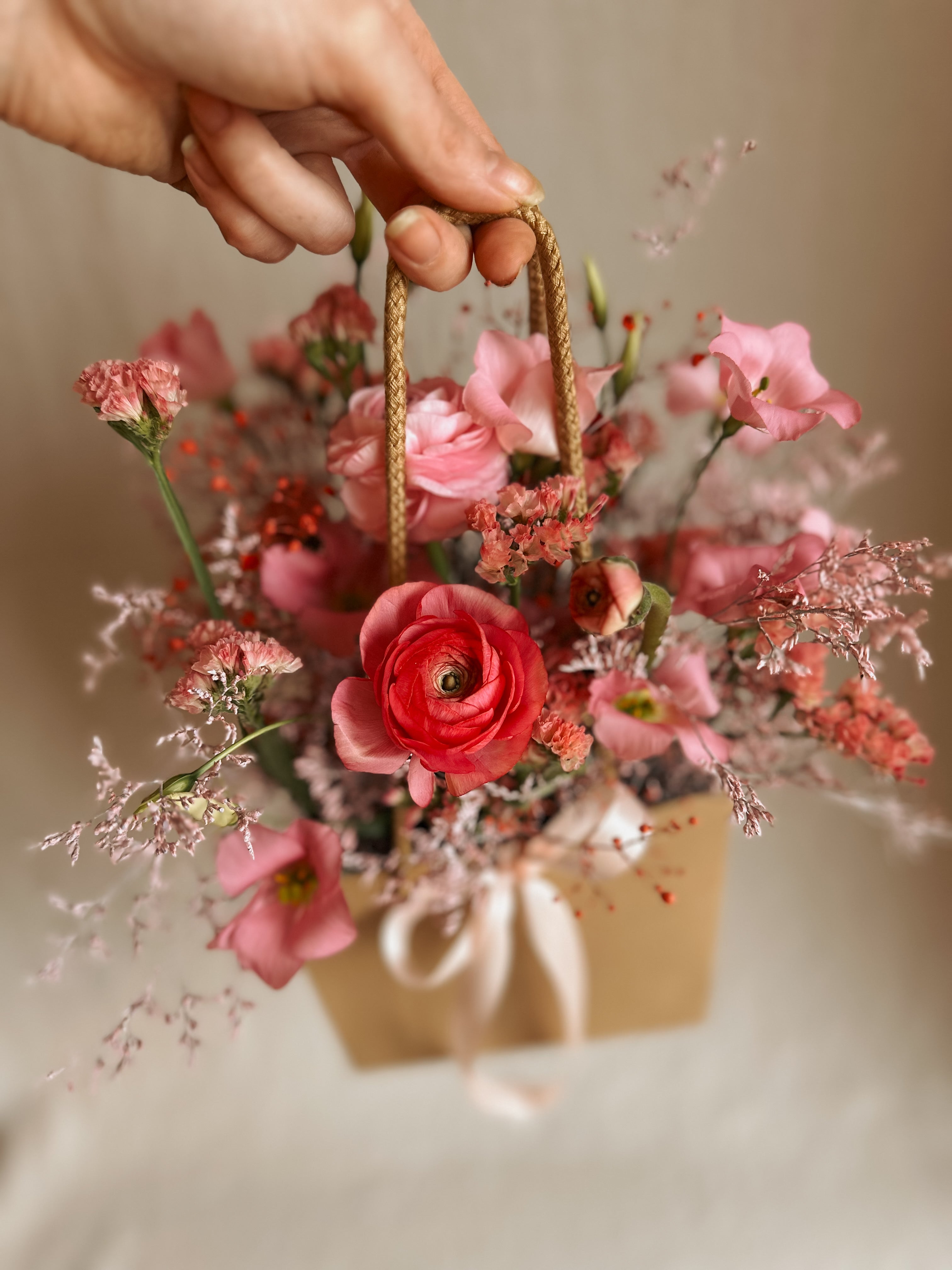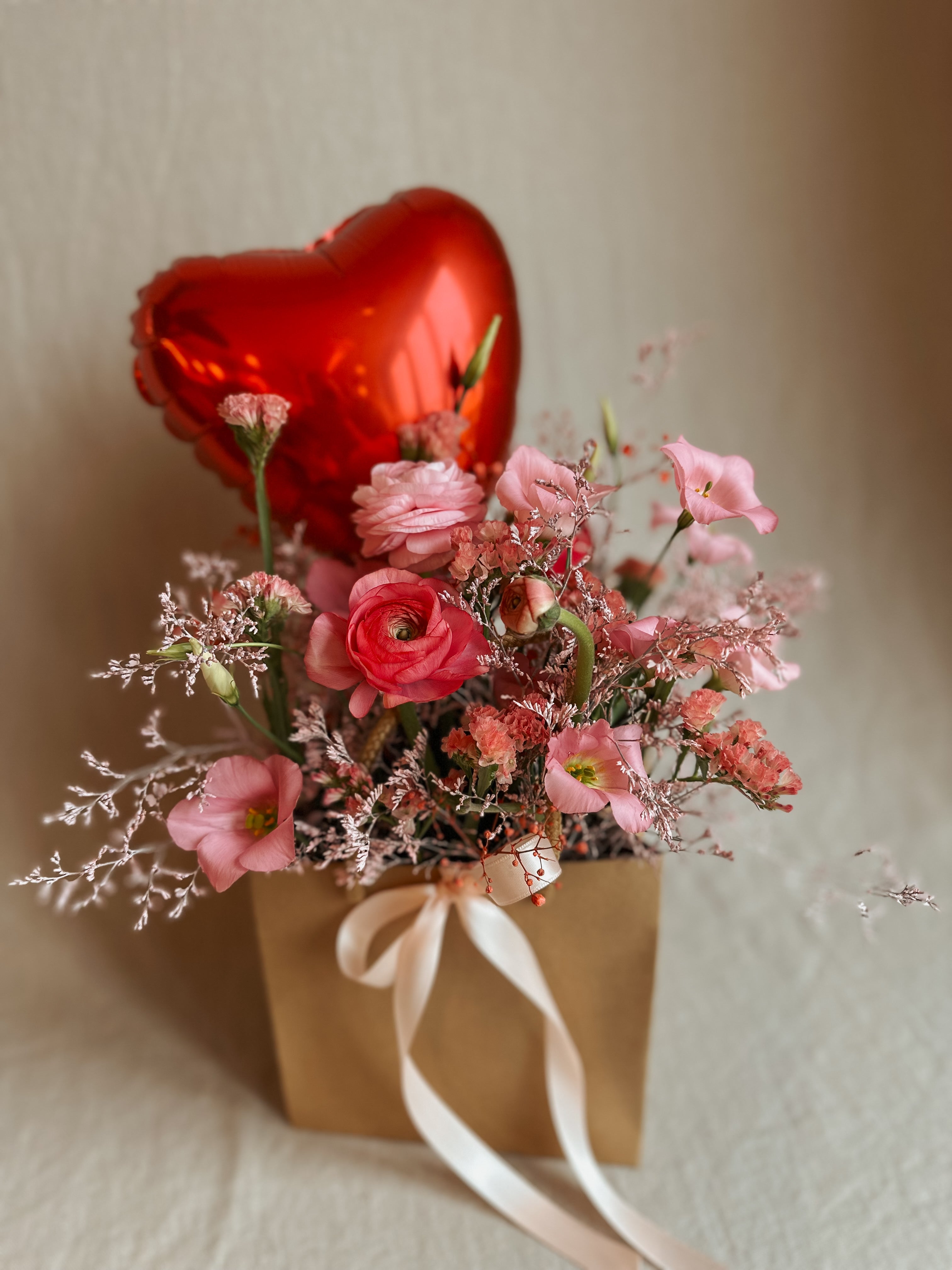 Mit oder ohne Ballon-Herzli, gefüllt mit pinken Ranunkeln, Eustoma und Limonium. Eine Kombination, die zart wirkt, aber trotzdem richtig öppis hermacht. Romantisch, modern und ein bisschen wow. Also genau das, was man am Valentinstag braucht.