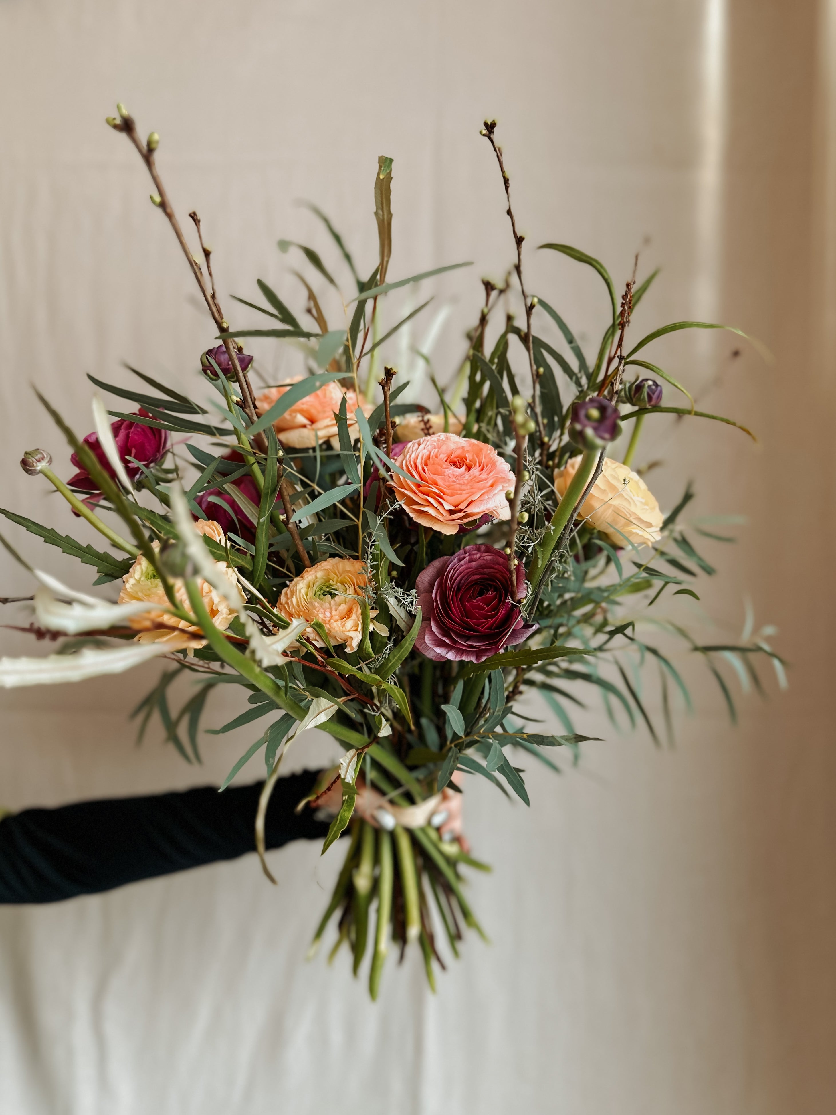 Ein Strauss, der uns einfach froh macht: Die Ranunkeln kommen entweder hell & fröhlich bunt daher oder kräftig & satt in leuchtenden Farben – je nach Stimmung. Dazu mischen wir frisches Grün und winterlichen Blütenäste. Das Endprodukt ist wie immer nicht geschniegelt, sondern wunderbar locker gebunden.